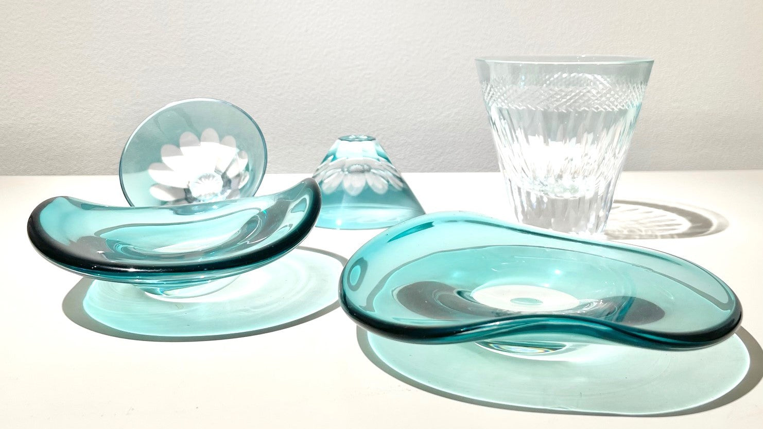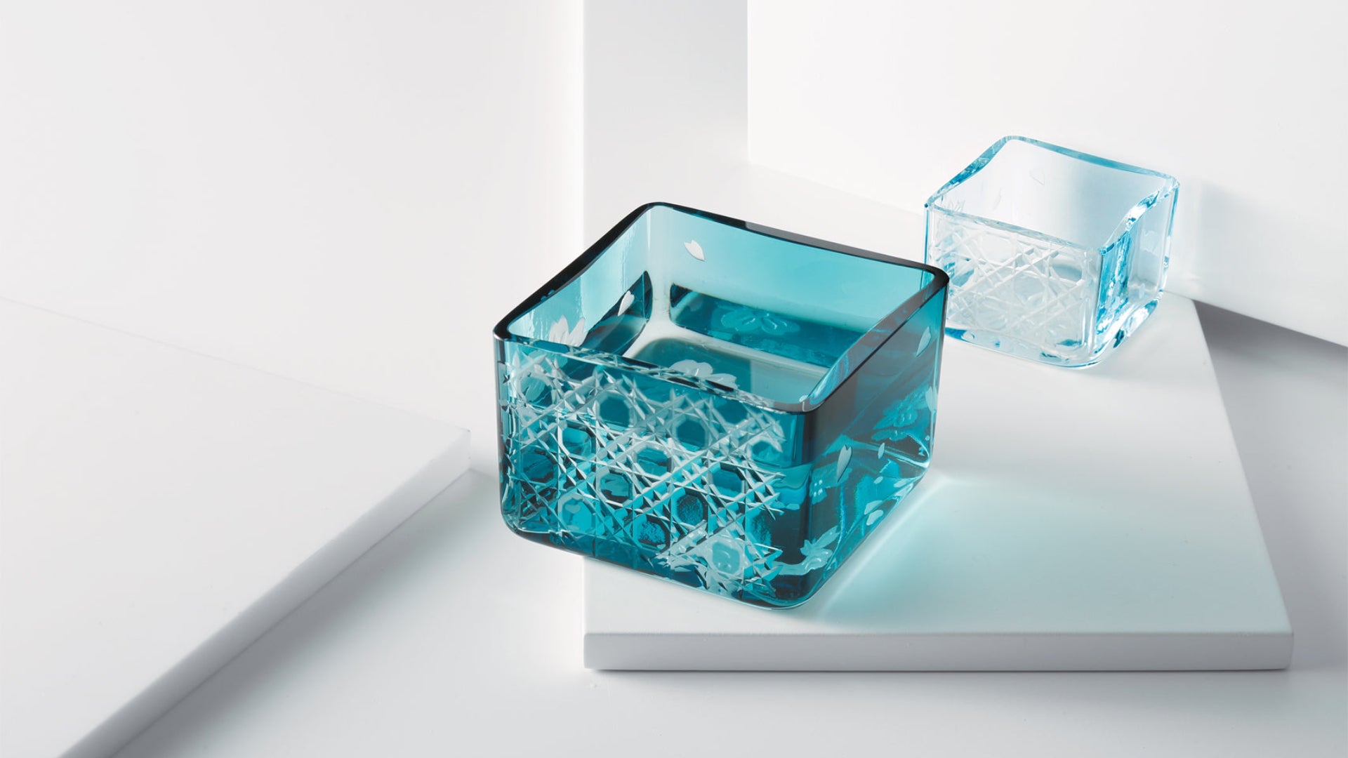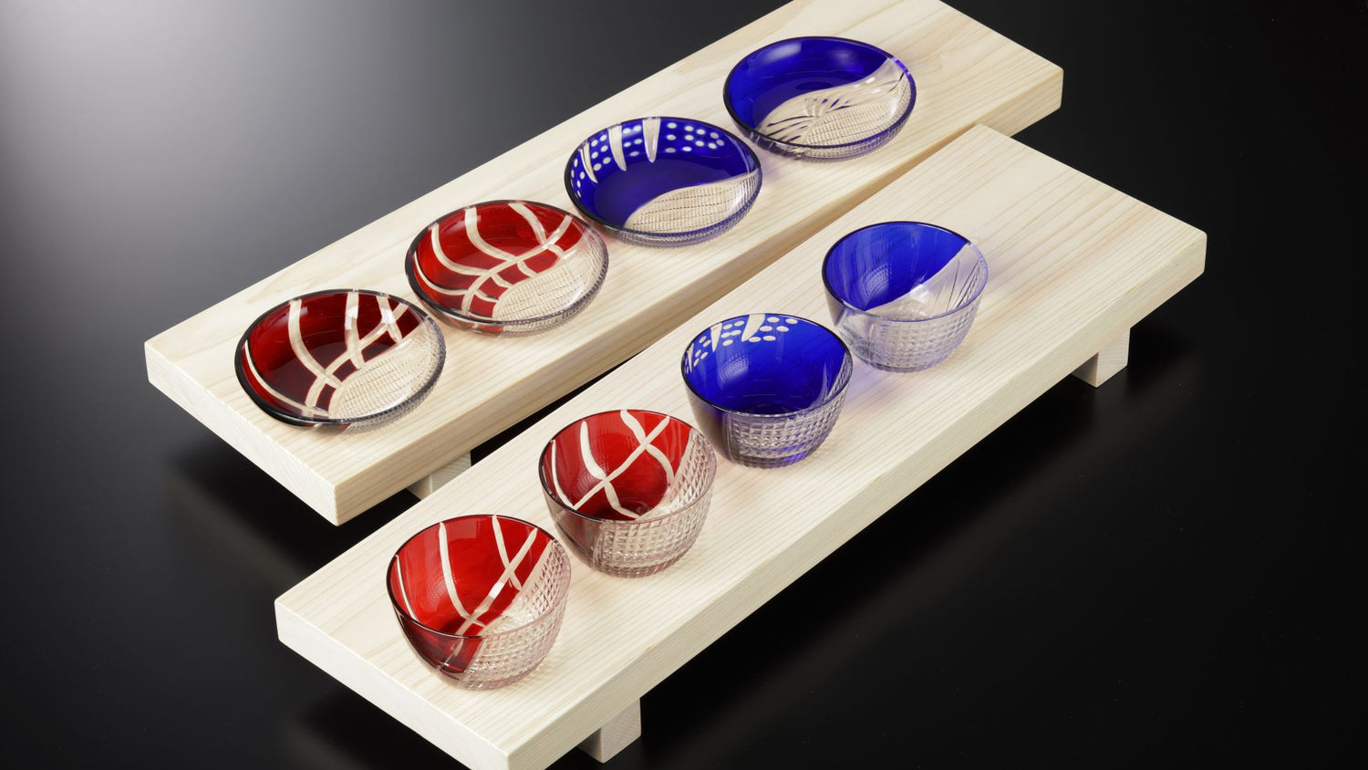 繊細な菊繋ぎ切子と大胆なカッティングが印象的な煌きシリーズ切子を楽しみ、色のコントラストを楽しみながら使うことのできる手仕事ならではの作品です