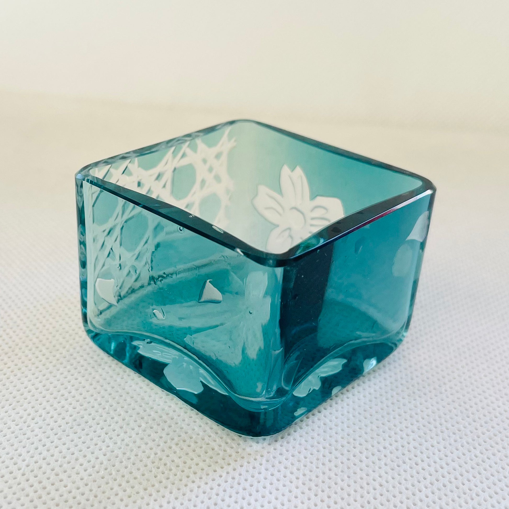 端材から生まれた新しい色<翠(すい)色>を纏い、吹いて作る江戸硝子の技法で仕上げた桝の形のグラスです。